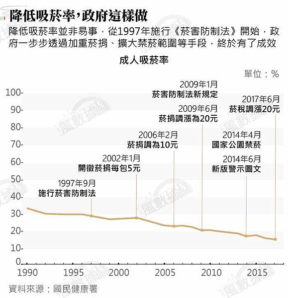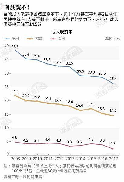 能想像台灣成人吸菸率也曾居高不下,甚至成年男性平均每2人中就有1人菸不離手的景象嗎?儘管歷經各界近30年的努力,包括頒布施行《菸害防制法》、菸稅之外還開徵菸捐並逐年調升,加上公共場所禁菸範圍擴大等,種種努力讓國內整體成人吸菸率到2017年時已大幅降至14.5%,不過,要達到「無菸國家」的目標,顯然還有一段很長的路要走。