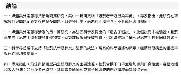 【事實釐清】外電報導「吸菸者新冠感染率低?法擬進行尼古丁實驗」、「尼古丁可能有助降低新冠病毒感染風險」? | 台灣事實查核中心