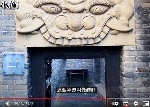 死囚牢在普通牢房的南盡頭,迎面牆上畫有一個龇牙咧嘴的巨大"虎頭",下面有個十分低矮狹小的門洞,恰似虎口。 "虎頭門"僅高3尺,牆壁卻有8尺厚。 雙門雙牆,堅固異常。 進入此門,不僅要大彎腰,還得屈腿下蹲。 牢門頂上的「虎頭」,其實並非老虎,而是一種傳說中的猛獸——狴犴。 明代學者楊慎說:「俗傳龍生九子不成龍,各有好。 ...... 四狴犴,形似虎,有威力,故立於獄門。 古人說它"平生好訟",所以把它的尊容畫在獄門之上。