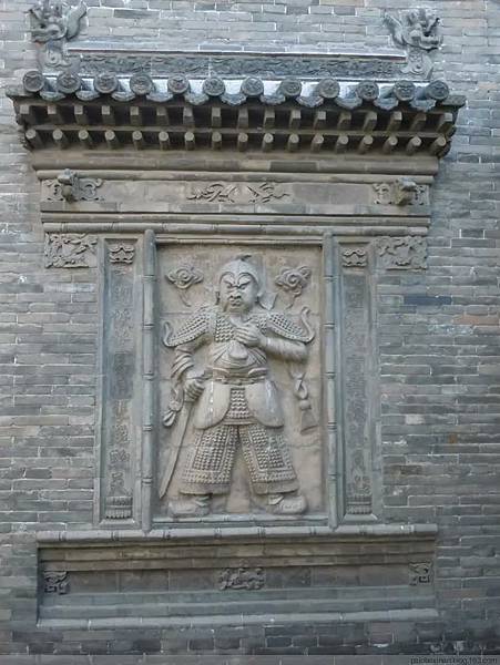 下圖、照壁,中間雕刻的一員武將形象,兩側陰刻對聯為:心田坦坦宜種德莫負心 天網恢恢易造孽難欺天