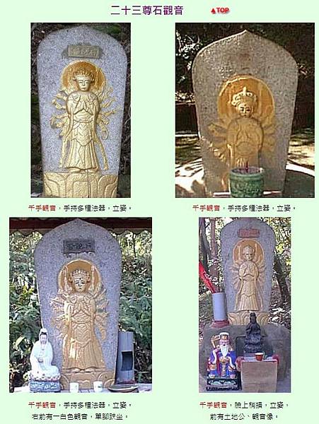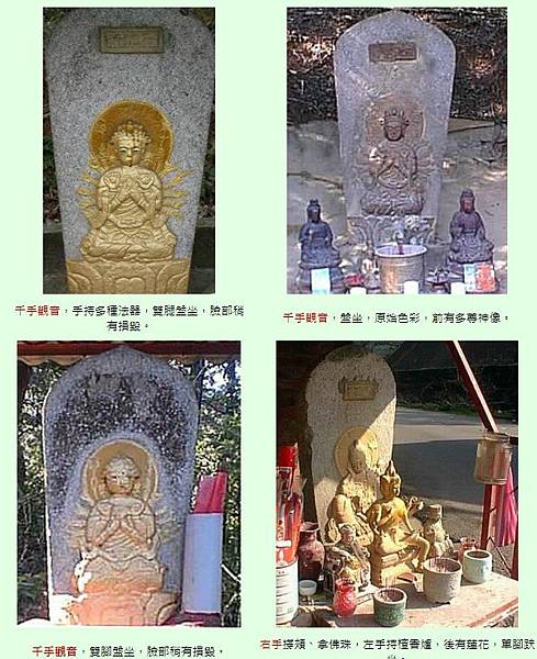 它承受敬愛者的呵護,失去了自然純樸的氣息;它也在崇拜者的仰慕裡,潛身安放在私人庭園;因此目前找的到的石觀音,剩下二十三尊,另一尊位於瓦管處瓦斯槽旁,因缺乏整修,已有風化損毀情形。