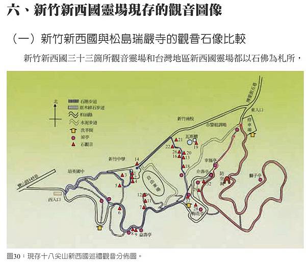 張德南說,新竹十八尖山到新竹公園從清朝以來就是墳場,日本據台後,將十八尖山闢為森林公園,山上及公園的墳墓遷移,也同時安置三十三觀音,這些觀音像有鎮煞功能,也是尋聲救苦的化身。