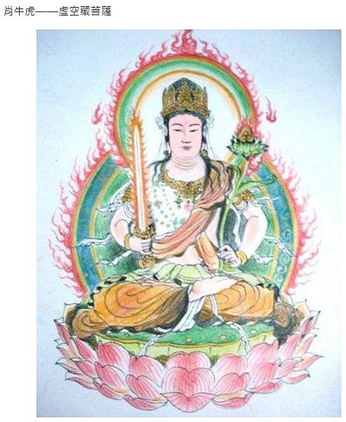 虛空藏菩薩身呈寶色,頂戴五佛冠,右持寶彗劍,左持寶蓮,又被稱作虛空孕、虛空庫,是佛教八大菩薩之一。虛空藏菩薩在眾多菩薩中專主智慧、功德和財富。因其智慧、功德、財富如虛空一樣廣闊無邊,並能如願滿足世人的需求,使眾生獲得無窮利益。難怪身邊肖牛和肖虎的朋友都那麼厲害,原來有這麼一位厲害的守護神!