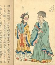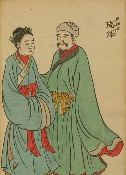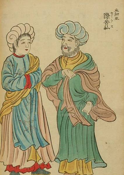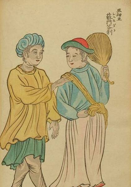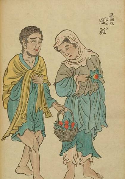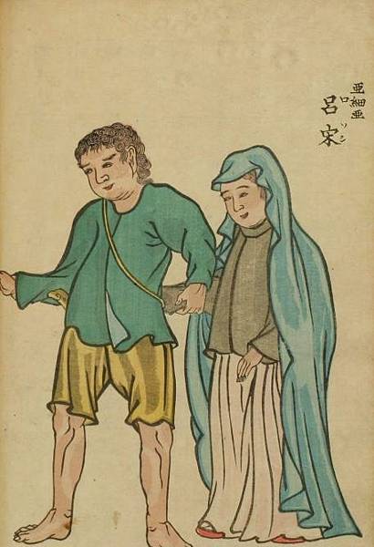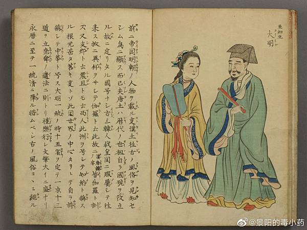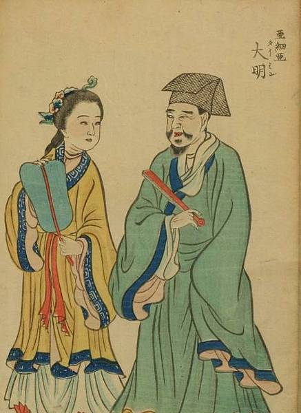 參照同一本《繪本》另一幅圖片,可留意到作者並非“寫生”(因1855年早已不是明朝,華夏中原人士亦非明装),可能是臨抄自其他人的作品。來源待查。
