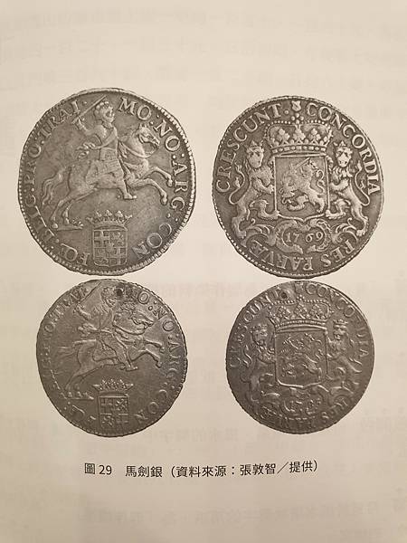 「馬劍銀」「荷蘭盾」台灣史上第一套通行貨幣-稱作「馬劍銀」的荷蘭錢幣(The Dutch Silver Rider Ducaton ),又稱為「荷蘭盾」。正面中央鑄有騎士執劍-反面中央為一面盾牌,盾牌上方有一頂王冠,左右各有一隻戴冠雄獅,盾牌內還有一隻戴三葉王冠雄獅,右前肢揮舞出鞘利劍,左前肢持一束金色箭翎,錢幣周圍鑄文:「Concordia Res Parvae Crescunt 」( Unity makes strength,團結就是力量 )。