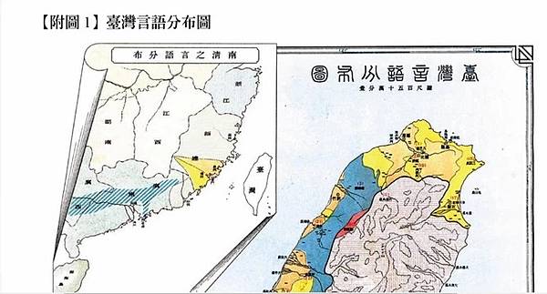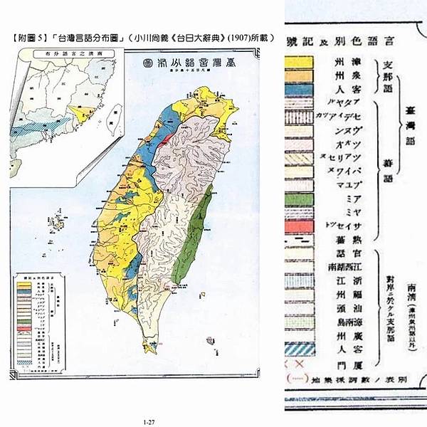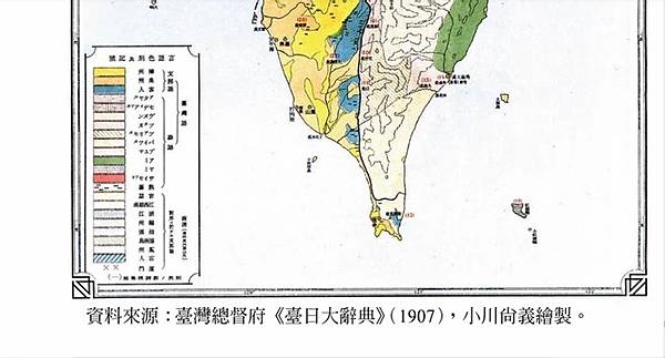 圖片說明:1907年台灣語言分布圖 小川尚義《台日大辭典》