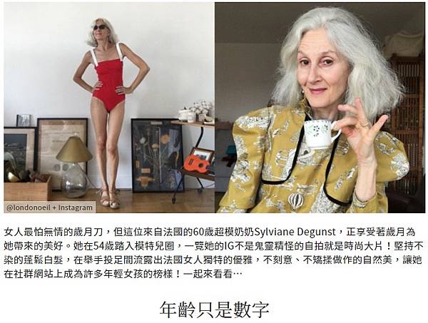 看著Sylviane Degun的照片,可以發現她非常享受生活!她就曾透露自己最重要的美麗祕訣,就是「快樂!快樂,比容貌重要!」把生命充實過著,優雅且快樂的老去,是我的生活哲學!年齡只是數字! 法國62歲超模:快樂比容貌重要 https://bit.ly/3wC2kRV