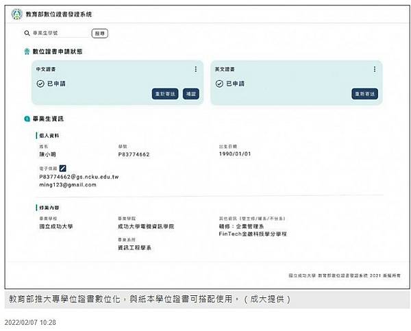 教育部高教司科長陳浩說明,配合國家發展委員會規劃「智慧政府行動方案(My Data 數位服務個人化)」等資訊應用,教育部自109學年度啟動大專院校數位證書試辦計畫,委由國立成功大學資訊工程學系副教授莊坤達、數學系副教授舒宇宸所帶領團隊開發建置並訂定數位證書標準規範,以全力推動數位學位證書發行,預計將於111學年度(今年8月1日起新學年)分批針對當期畢業生正式發放數位學位證書,目前試辦則已發放近4萬張數位學位證書。