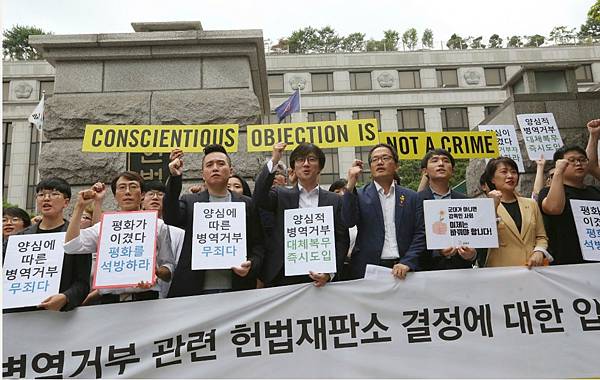 2018年6月,在南韓憲法法院外,民眾齊聚一堂聲援拒服兵役被下獄的「良心反對者」,他們手拿寫有「良心反對不是罪」字樣的標語。