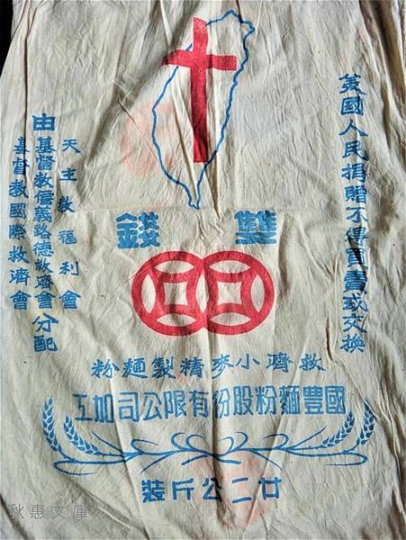 美援物資來到台灣,發放系統主要是「耶穌廟」(教會)、眷村,內容包括脫脂奶粉、麵粉、食用油等,有時政府進行造橋鋪路等工程,召集村民打工,薪水可能就是3袋麵粉、2瓶油。窮到連棉被都可以當的百姓們,麵粉吃完了,難得有一塊純棉的麵粉袋布料,惜物愛物,就改成內衣褲繼續穿。