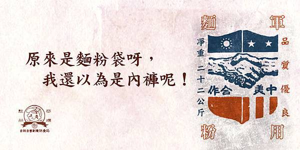 麵粉袋首次出現,是二戰後的1951-1965美援年代。當時美國為了圍堵共產勢力擴張,同時解決自身糧食過剩的問題,策劃了「480法案」,幫助第三世界解決飢荒,到處半買半送物資,以免被赤化,當中也包括台灣。