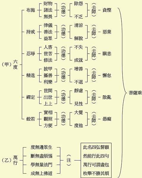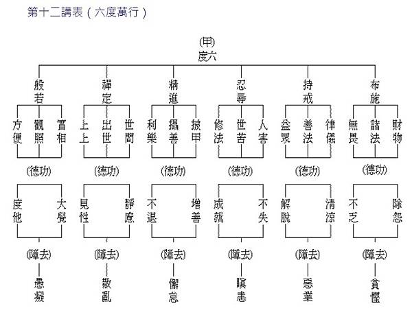 第十二講表「六度萬行」,這是菩薩法。修菩薩道,中國菩薩道學大乘法,各宗有各宗修的正功夫的方法。但是無論那一宗,「六度」是共通的,是通用的法。「度」,是中國的意思,印度文叫做「波羅蜜」,金剛經是金剛般若波羅蜜,心經是般若波羅蜜多心經。波羅蜜翻成中國的意思就是「度」,就是度到彼岸。波羅蜜加一個尾音叫波羅蜜多,簡單叫波羅蜜。波羅蜜多翻成中國意思就是「到彼岸」,到達彼岸了,到了彼岸就是度。比如說在海裡面,有一條船,坐了船就是渡上岸了,就是這個意思。這是比喻的話,海是生死苦海,我們在六道裡的眾生都是在這個苦海裡面。在這個苦海裡面,誰能夠自己渡到上岸啊?那只有憑佛法,菩薩用六種度眾生的方法來行他的菩薩道,六度就是六波羅蜜。還有「萬行」,行這個字在古印度叫「ㄏㄥˊ」,萬行(ㄏㄥˊ),你現在「ㄏㄥˊ,ㄏㄥˊ」一般人聽不懂,就萬「ㄒㄧㄥˊ」好了,讀萬行「ㄒㄧㄥˊ」。行是除了六大類以外,其餘太多太多,用四弘誓願把它包含住了。