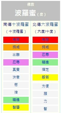 波羅蜜是梵語,意為到彼岸.渡河的人,須乘舟筏橫越中流,到達彼岸。學佛的人,由生死輪迴的此岸,渡過煩惱中流,到達涅槃寂靜的彼岸。在這裡,六波羅蜜就是舟筏,可渡菩薩行者到達彼岸。六波羅蜜的內容如下: