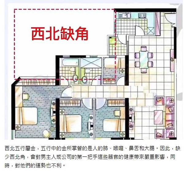 家中缺西北角,涉及的問題比較多,以下大概列舉幾項: