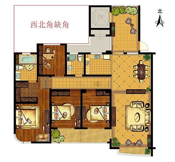 3、房子缺西北角會對男主人或者公司一把手帶來重要影響。由於男主人是一家之長,在家裏佔主要地位,因此這個角絕對不能缺。