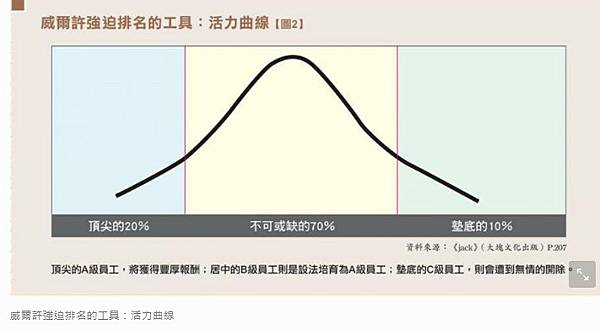 他認為,員工能力會呈現鐘型分配,他便利用活力曲線,強制將員工排名成前20%、中70%、後10%,而尾端10%的員工將遭淘汰。