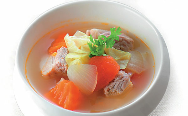 將瘦的豬後腿肉切塊,以少許醬油、糖、小麻油、胡椒、一點酒醃一小時,再加入其他四種切好的蔬菜(香菜除外),加入適量的水,置於電鍋燉煮約40 ∼ 50 分鐘直到所有食材軟爛。羅宋湯 - 維基百科,自由的百科全書 https://bit.ly/3e7zphj