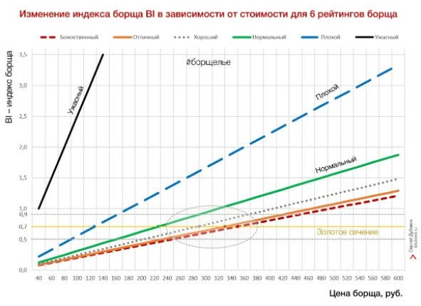 我在2019年嘗試的大部分羅宋湯都落在250-370盧布的價格範圍內,因此,我們可以觀察到,價格合理,品質最高的羅宋湯具有"神聖","優秀"和"良好"評級。 BI低於1,最佳範圍為0.5-0.9。 然後,BI羅宋湯指數為0.5-0.9的邊界可以稱為最佳邊界,該範圍0.7的平均值就是"羅宋湯的黃金分割"。