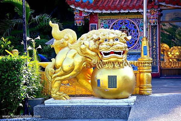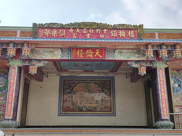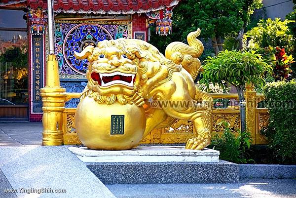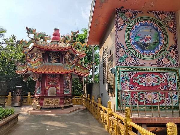 1970年代改建成宏偉壯觀的「妙靈宮」,後來陸續增加閃亮金獅與氣派戲台。唯,美中不足的是,酬神賽會用的戲台竟然未面對「妙靈宮」正門,伯公還得先出廟門外才能看戲。(1)廟門一對金獅與新竹新埔枋寮義民廟前的那一對相同。