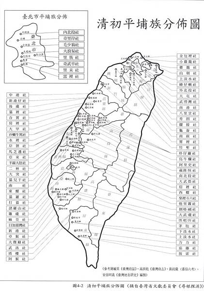 台灣的平埔族群:凱達格蘭(Ketagalan)─巴賽(Basay)、雷朗(Luilang)、龜崙(Kulon)、巴宰(Pazih)、噶哈巫(Kaxabu)、道卡斯(Taokas)、拍瀑拉(Papora)、巴布薩(Babuza)、洪安雅(Hoanya)─阿立昆(Arikun)、羅亞(Lloa)、西拉雅(Siraya)、馬卡道(Makattao)、大武壠(Taivoan)、哆羅美遠(Torobiawan)、猴猴(Qauqaut)、噶瑪蘭(Kavalan)族等。