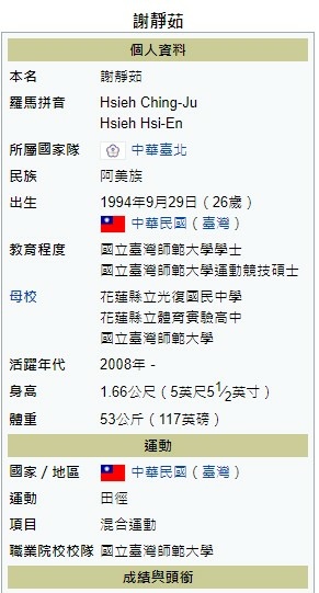 出身自花蓮玉里鎮宮前部落的體育世家,父母都曾是跆拳道選手。在2015年起改名為謝喜恩參賽。楊俊瀚則是她的表弟。