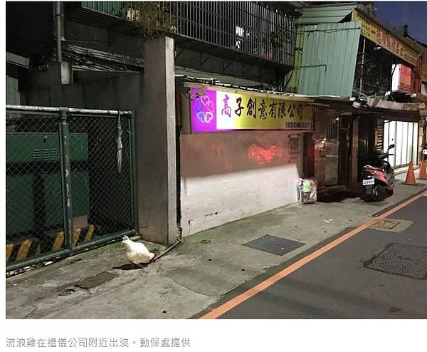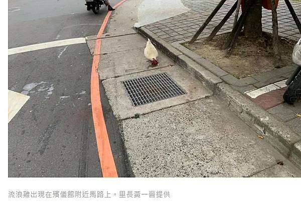 流浪雞出現在殯儀館附近馬路上。里長黃一晉提供
