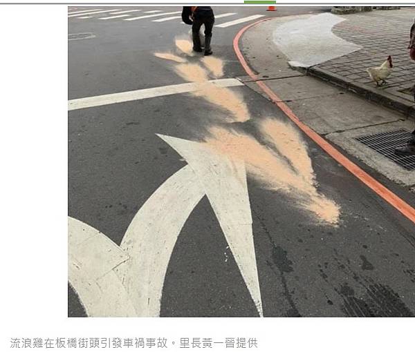 流浪雞在板橋街頭引發車禍事故。里長黃一晉提供