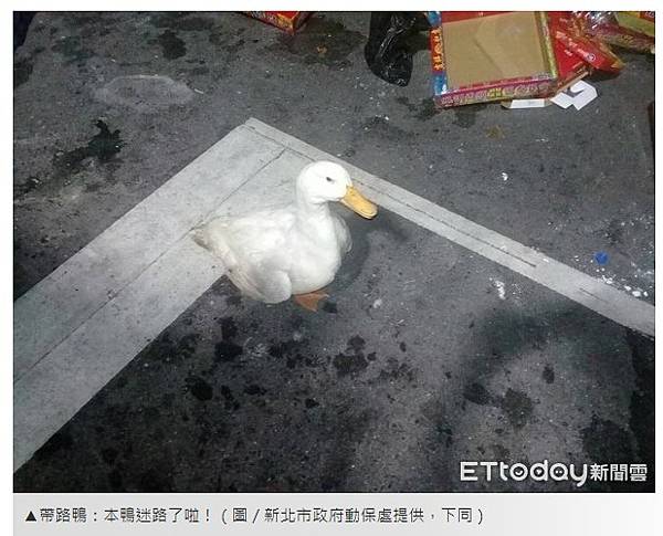 全國首創!新北市政府動保處時常接獲民眾通報,有白鴨在板橋環河西路四段長江停車場旁遊蕩,或是殯儀館附近巷道、公園看到流浪的雞鴨。這些雞鴨為民間喪葬習俗的「帶路鴨」、「開光雞」,一些殯葬業者隨地棄置,導致這些小動物驚慌失措亂跑,發生不少騎士為了閃躲而摔車。►ETtoday寵物雲有IG了,來追蹤我吧!