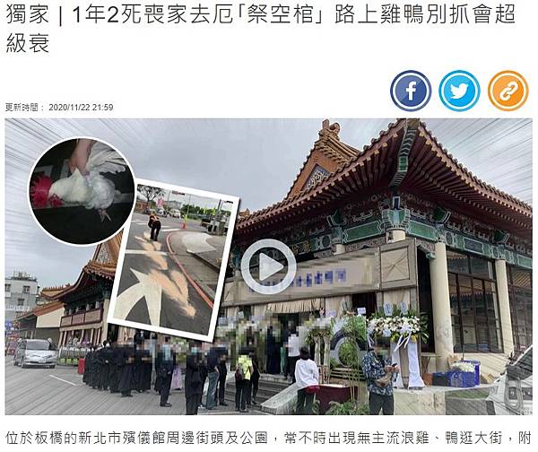 《臺灣殯葬資訊網》109/08/12臺灣殯葬資訊網-新北市新創「殯葬雞鴨」登記制 「祭三喪」開光雞帶路鴨不流浪 https://bit.ly/3imGEn4