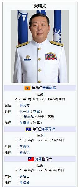 2020年1月15日晚,國防部表示,奉總統蔡英文核定,參謀總長由海軍司令黃曙光二級上將接任。該月2日UH-60M黑鷹直升機失事,造成時任參謀總長沈一鳴二級上將殉職(追晉一級上將),由副參謀總長兼執行官劉志斌二級上將代理數日,直至黃曙光接任為止。調任案1月16日生效。[1][2][3]