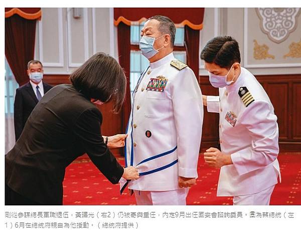 剛從參謀總長軍職退伍,黃曙光(右2)仍被寄與重任,內定9月出任國安會諮詢委員。圖為蔡總統(左1)6月在總統府親自為他授勳。(總統府提供)© 由 鏡週刊 提供 剛從參謀總長軍職退伍,黃曙光(右2)仍被寄與重任,內定9月出任國安會諮詢委員。圖為蔡總統(左1)6月在總統府親自為他授勳。(總統府提供)