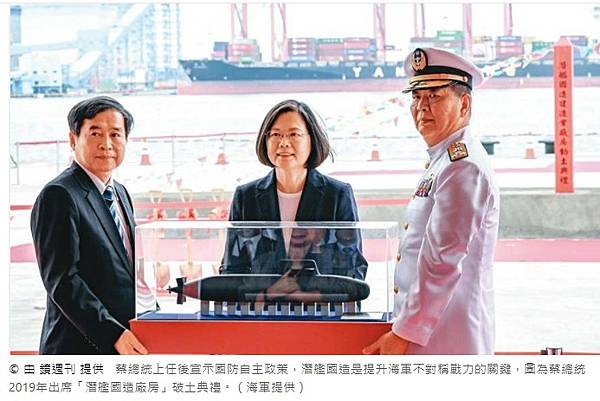 蔡總統上任後宣示國防自主政策,潛艦國造是提升海軍不對稱戰力的關鍵,圖為蔡總統2019年出席「潛艦國造廠房」破土典禮。(海軍提供)© 由 鏡週刊 提供 蔡總統上任後宣示國防自主政策,潛艦國造是提升海軍不對稱戰力的關鍵,圖為蔡總統2019年出席「潛艦國造廠房」破土典禮。(海軍提供)