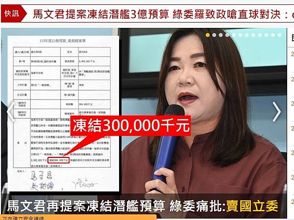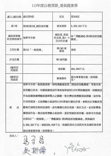 王定宇稍早發布臉書,公布一張預算提案單,由馬文君領銜、國民黨立委吳斯懷及廖婉汝共同提案,該提案單載明,113年度國防部海軍司令部歲出預算中「潛艦國造第二階段原型艦籌建」為39億3263萬1000元,馬文君等人提案凍結3億元,約為該筆預算的1/13。