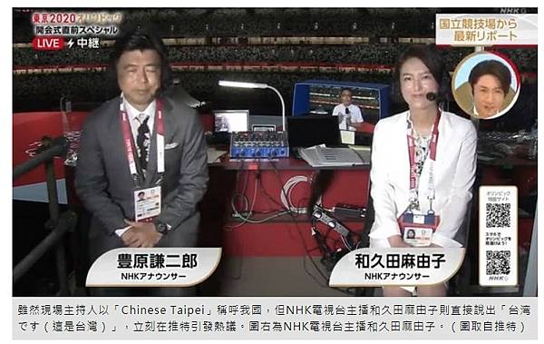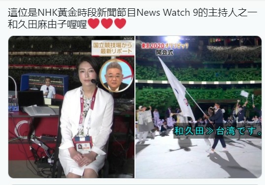 在台灣隊進場時,擔任NHK黃金時段新聞節目「News Watch 9」的32歲的資深女主播和久田麻由子聽到中華台北的英文後馬上說道:「台湾です。」以「台灣」來取代「Chinese Taipei」的稱呼,引起推特熱議,不少日本網友也跟著刷一排、「台湾です」、「台灣!」也有台灣網友直呼「這是今晚最感動的4個字!」、「台灣加油!日本加油!」。