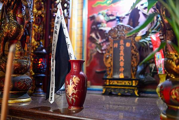 描述:民國69年(西元1980年),新埔義民廟打醮普渡,領調時領的紀念品,當成紀念同時也一起供奉。新屋地區 客家人,以前家中有神明廳的就一定會供奉義民爺,以顯對義民爺的尊重,義民爺由於無神像,大都用令旗拿來做代表供奉,而且每年的過年都會抽空回新埔過火。 目前在鄉間常看到神明廳的神龕上有放義民爺令旗的,也有放褒忠紀念牌,也有放新埔義民廟前山門相片,這些種種都是證明客家人對義民爺的景仰。褒忠紀念牌外 框為塑膠製品,內為紙張印刷「褒忠」二字,報導者許春發說祂一樣是義民爺代表,放在神桌上不為過。