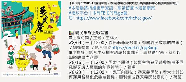 新竹縣政府文化局表示,為了讓全國民眾能一同參與義民祭,也首度推出系列線上活動,8月19日還有一場舉辦「義民祭線上講堂」,8月16、23日則是「義民祭影音故事」,由文化局圖書館故事志工講述故事,歡迎親子來參與,不管你是不是客家人,想深入領略全國義民祭典、了解義民祭在拜什麼、傳奇故事趣聞及文化意涵,都可以上竹縣go藝思收看!