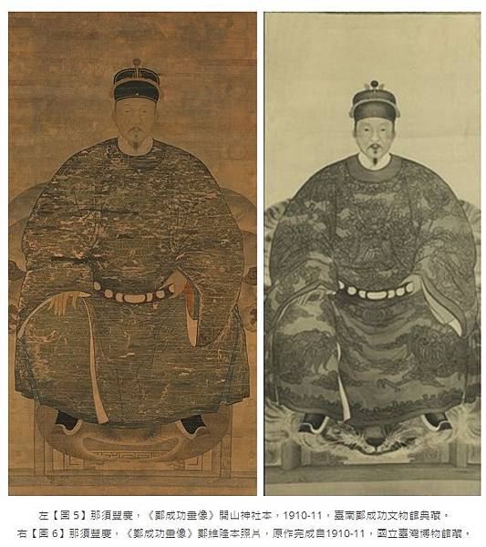 在官邸期間,那須總計完成兩幅《鄭成功畫像》的摹本,一幅被奉納至祭祀鄭成功的開山神社中(以下稱「開山神社本」【圖5】),另一幅則贈予鄭維隆家族(以下稱「鄭維隆本」【圖6】)。而原跡因被視為「臺灣古美術唯一之資料」,因此以「國寶」規格奉納到坐落在臺北劍潭山上的臺灣神社(今圓山大飯店址)。