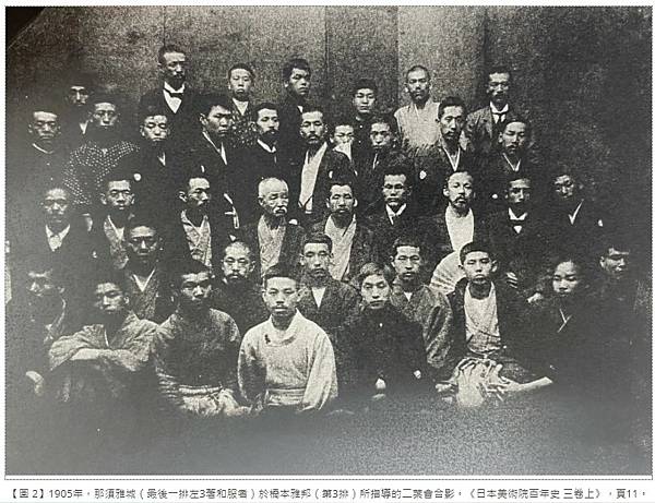 【圖 2】1905年,那須雅城(最後一排左3著和服者)於橋本雅邦(第3排左4)所指導的二葉會合影。《日本美術院百年史 三卷上》,頁11。
