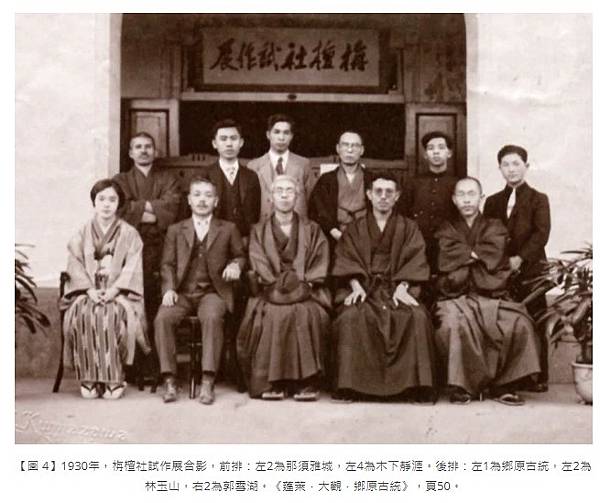 【圖 4】1930年,栴檀社試作展合影,前排:左2為那須雅城,左4為木下靜涯。後排:左1為鄉原古統,左2為林玉山,右2為郭雪湖。《蓬萊.大觀.鄉原古統》,頁50。