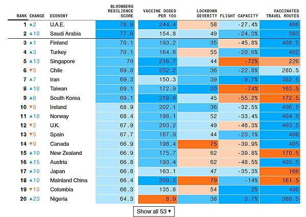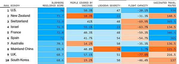 《彭博》續指,愛爾蘭、奧地利在這次排名中提升19名,並列進步最高的國家,這歸功於他們邊境管制的開放;新加坡則因為疫苗接種率來到75%以上,名次也往上提升;德國、芬蘭則因為死亡人數下降,都提升了超過10名。但是,面對變種病毒等種種挑戰,大幅開放到底會不會是魯莽之舉?將成為下個月決定排名的觀察重點。