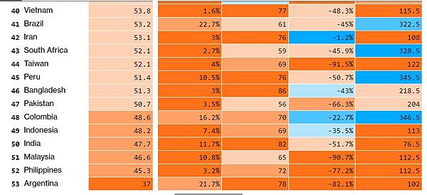 2021/10/28 美國媒體彭博(Bloomberg)日前公布最新「全球防疫韌性排名」(Covid Resilience Ranking),台灣10月排名再掉5名,於53個列入評比的經濟體中排第47名,僅排在印尼、羅馬尼亞、馬來西亞、泰國、越南及菲律賓之前,成為倒數第7名。全球防疫韌性排名》台灣跌至倒數第7 表現最差的是這兩項指標 https://bit.ly/3bls6kt