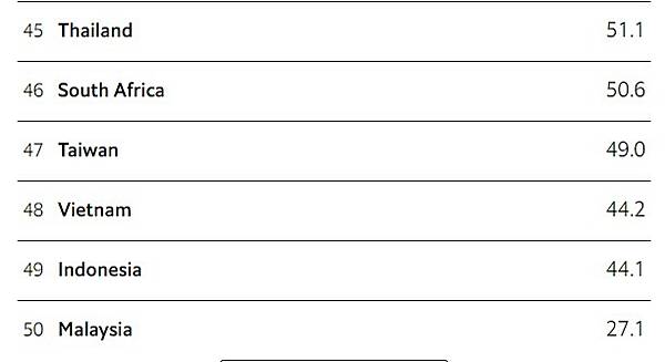 台灣10月排名再掉5名,成為第47名。其中,台灣在航班載客能力與接種疫苗旅客自由度上表現較差,在封鎖嚴重度則表現普通。其他亞洲地區中,南韓排名最高,比上個月上升12名,目前排第14名,日本則是上升13名,排名第16名,香港則是下降1名,排第21名,中國下降5名,目前是第28名,新加坡下降20名,排第39名,菲律賓、越南、泰國、馬來西亞等地疫情仍相當嚴重,防疫韌性排名也墊底。