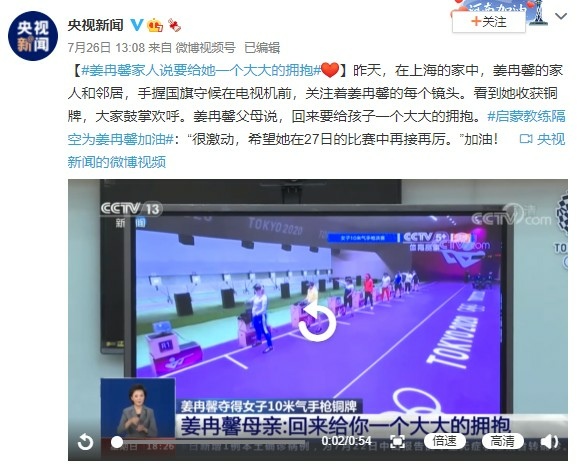 7月26日,姜冉馨/龐偉獲得十米氣手槍混合團體賽冠軍,賽后在接受採訪時,姜冉馨談及比賽時表示開頭有點緊張,後邊就穩住了,對於自己的第一次奧運之旅,姜冉馨則稱:還懵懵懂懂。