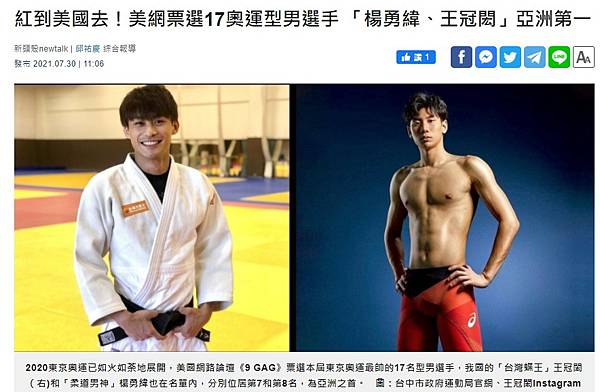 2020東京奧運已如火如荼地展開,美國網路論壇《9 GAG》票選本屆東京奧運最帥的17名型男選手,我國的「台灣蝶王」王冠閎和「柔道男神」楊勇緯也在名單內,分別位居第7和第8名,為亞洲之首。