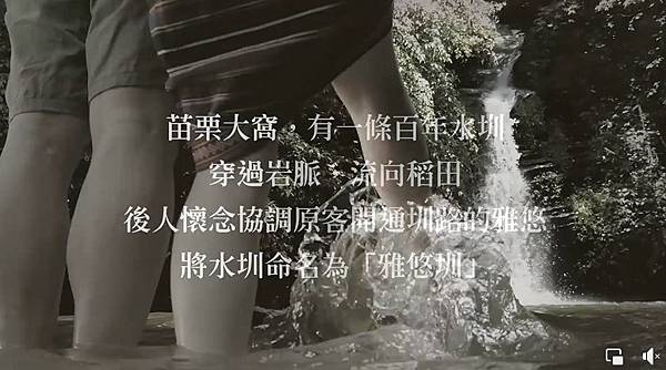 苗栗大湖鄉,有一條水圳,是百年前嫁入客家聚落的原住民女子「雅悠」,居中協調,開鑿完成的一條水圳,她不只促成客家和原住民合作,開鑿水圳,也開啟兩個族群的融合與往來