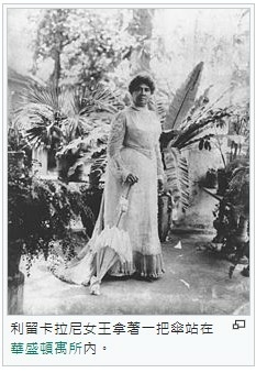 利留卡拉尼女王拿著一把傘站在華盛頓寓所內。