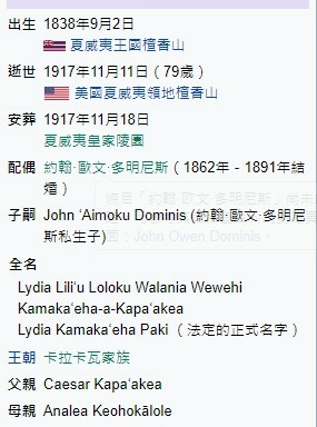 王儲: David Kawānanakoa (1868-1908, 卡拉卡瓦國王養子, 卡皮歐拉尼王后外甥) ∞ 王儲夫人: Abigail Campbell Kawānanakoa (1882-1945)