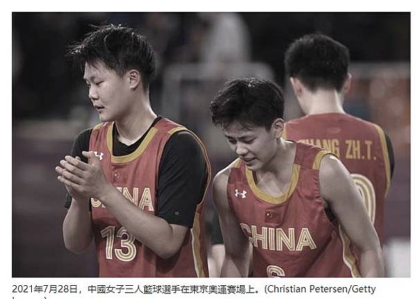 2021年7月28日,中國女子三人籃球選手在東京奧運賽場上。(Christian Petersen/Getty Images)