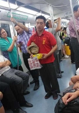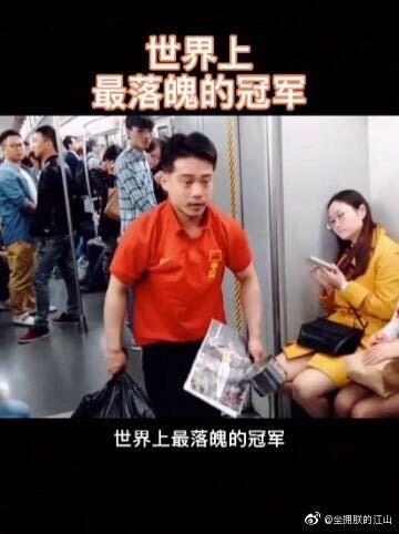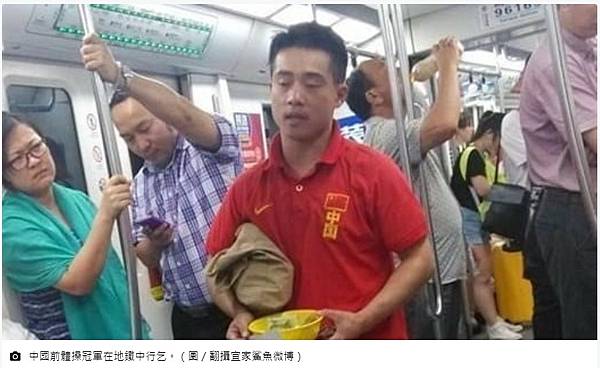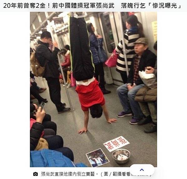 照片中的男子為中國前體操冠軍張尚武,他身穿中國國家隊體育服,手上拿著一張寫有自己名字的牌子,在地鐵車廂中行乞。