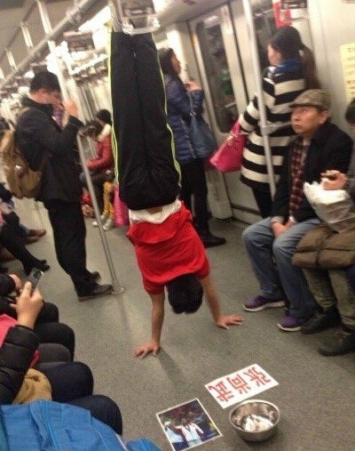 張尚武直接地鐵內倒立賣藝。(圖/翻攝看看新聞微博)